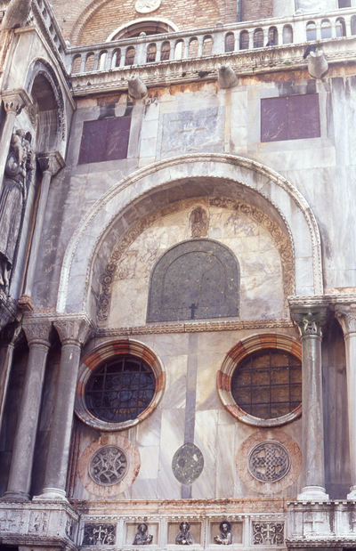 One can look on the outside of the church and start spotting Byzantine features rather easily. There are marble panels, relief sculptures, colorful marble columns, and column capitals all coming from Constantinople. There are mixed in with the stolen columns, some Venetian imitation columns as well. Porphyry however was not available at the time, and thus it is all spolia.