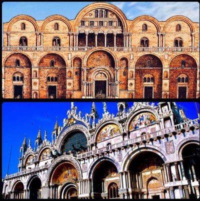St. Marks Basilica is truly great, it is a project which the Republic of Venice worked on for many centuries. Perhaps the biggest advancement in its grandeur was after the Venetians stripped as many things as they could from Constantinople to put on and in the church. The visual below shows the kind of upgrade which resulted from it, though much of it was also added later in the renaissance to be fair and accurate.