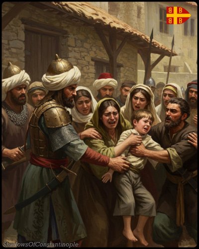 A Roman or other Christian family in lands conquered by the Ottomans would fear the devsirme, their sons being stolen. This is also sometimes called a “Blood Tax.” The earliest account of this comes from the Eastern Romans, after the fall of Thessaloniki“
