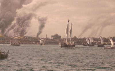 “According to Niketas (Choniates), the Venetians covered their galleys with ox hides as protection against fire, almost as though they expected to have to counter Greek Fire; however, neither he nor any Latin chronicler mentioned it actually being used against them. Some naval resistance was mounted in the Golden Horn by a few Byzantine ‘triereis‘ but these were either destroyed or driven ashore and abandoned. It is striking that whereas in 1043 the remnants of a similarly decayed Byzantine navy had been able to scatter the Rhos attack on Constantinople with Greek Fire, it was apparently not used in 1203. The implication is clear. At Constantinople in 1203 the Byzantine galleys were not equipped with Greek Fire.”