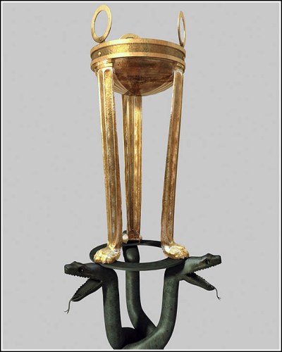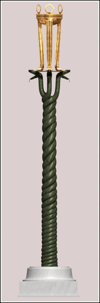 The serpent column was crafted to be a commemorative monument for the victory of the coalition of Greek city-states over the juggernaut that was the Acheamenid Persian Empire at the battle of Plataea. This monument was highly significant and emotional. Allegedly, the weapons of the fallen soldiers at the battle of Plataea were collected and melted down to get the bronze for the column. Thus, it is is literally made of the same weapons which fought for the freedom of Greece from Persian domination. It also had a golden tripod on top of it. It was presented as a gift to Apollo and placed in his temple at temple in Delphi. Archaeological studies of the serpent column shows that the names of city-states which fought at Plataea are still inscribed in bronze on the base of the serpent column.