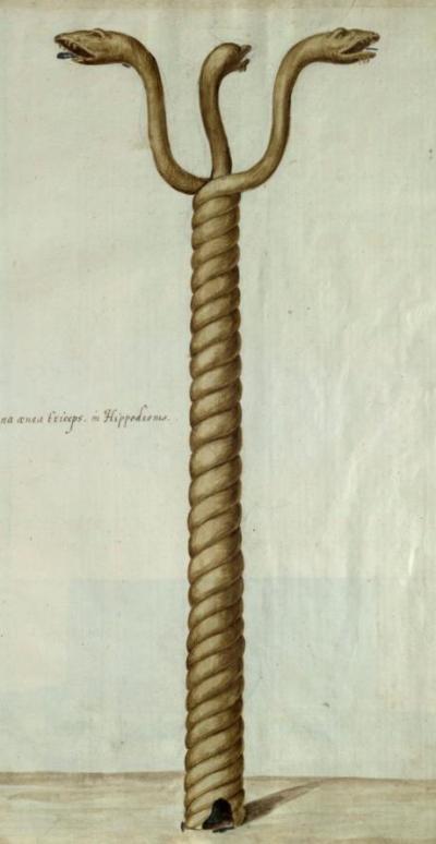 “and between those columns there are three copper figures of serpents. They are twisted like a rope, and they have three heads, with open mouths. It is said that these figures were of serpents who were put there, on account of an enchantment which was affected. The city was used to be infested by many serpents, and other evil animals, which killed and poisoned men; but an emperor performed an enchantment over these figures, and serpents have never done any harm to the people of the city, since that time.“