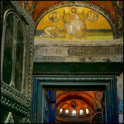 Leo’s successor Alexander could have put it up to show an impious Emperor begging for forgiveness, in contrast to showing himself as a pious Emperor in good standing. During the reign of Romanos Lekepanos, the Church finalized it’s stance on remarriages in 920. A second marriage was ok, a third was sinful but acceptable with special circumstances and with acts of penitence, a fourth was not acceptable. Mystikos saw this as a great victory for himself and the Church, and it is very possible the mosaic was then put up. The mosaic can be interpreted as the victory of the Patriarch Mystikos and the Church over the Emperor, and a warning to future Emperors who all walked through the Imperial door. The Church could deny an Emperor now just as Ambrose of Milan did to Theodosius the Great.