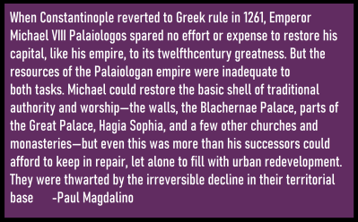 Just because the Emperor was back, the city’s fortunes were not. The wealth of the city was symbolically and literally stripped during and after the Fourth Crusade, it was impossible to get it back. One cannot simply reverse the desecration of places like the Holy Apostles and Hagia Sophia. It did improve, it did receive investment from Michal Palaiologos, but it could not be brought back to what it was. Michael did try, but he did not have the resources to create a new Late Antiquity style city. It took centuries for Constantinople to recover from its first decline following the Arab invasions and outbreaks of plague. The state had bigger resources then, and the population of Romans was far larger and they demographically dominated more lands. But demographic, fiscal, and territorial decline created a reality which was far different in the 13th century. The following passage from Paul Magdalino describes better than I can the transformation which occurred in Constantinople when it became the capital of the Roman Empire again: