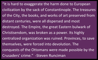 The Fourth Crusade was an event where a western army which swore an oath to God and their Church that they would go to Egypt to fight for the Holy Land was directed instead against the largest Christian city in the world. The crusaders attempted to divide the entire Eastern Roman Empire among themselves, but not fully succeed. Steven Runciman wrote in Byzantine Civilization that “A Latin Emperor was set up in Constantinople. Latin Lords overran the Greek peninsula…Venice took islands and built colonies along the coastline and won concessions that captured for her the whole Eastern trade. But the attempt to take over the whole Empire failed. Imperial Asia Minor remained in Greek-speaking hands. In the western Anatolian city of Nicaea, Alexius III’s son-in-law Theodore Lascaris established a court that soon became the quarters of the Empire in exile (commonly known as the “Empire of Nicaea”). At Trebizond, a Comnenus declared his independence, and in Epirus, an Angelus, who soon acquired Thessalonica from its Latin Lords. These three self-styled Empires disputed the claim to be the Roman Empire in exile, but Nicaea’s was always the most generally accepted and in the end triumphed.”
